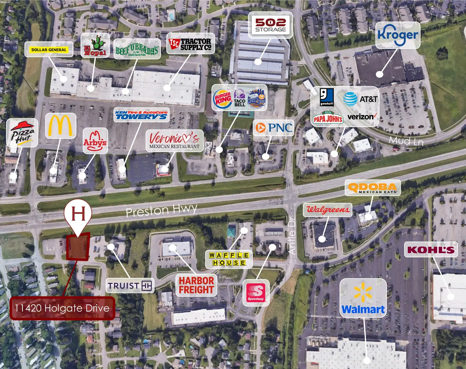 • Infill lot for sale across from McDonalds on Preston Hwy and adjacent to Truist Bank. Close proximity to both Walmart Supercenter and Kroger.