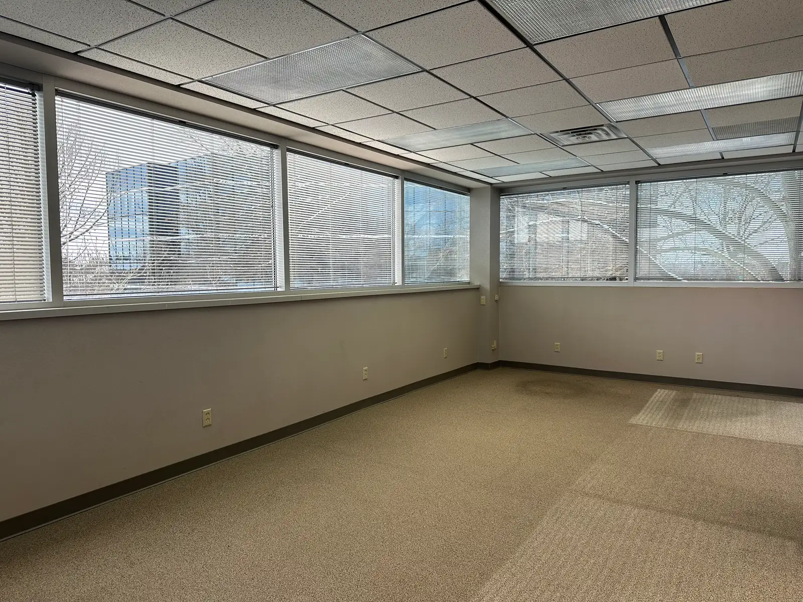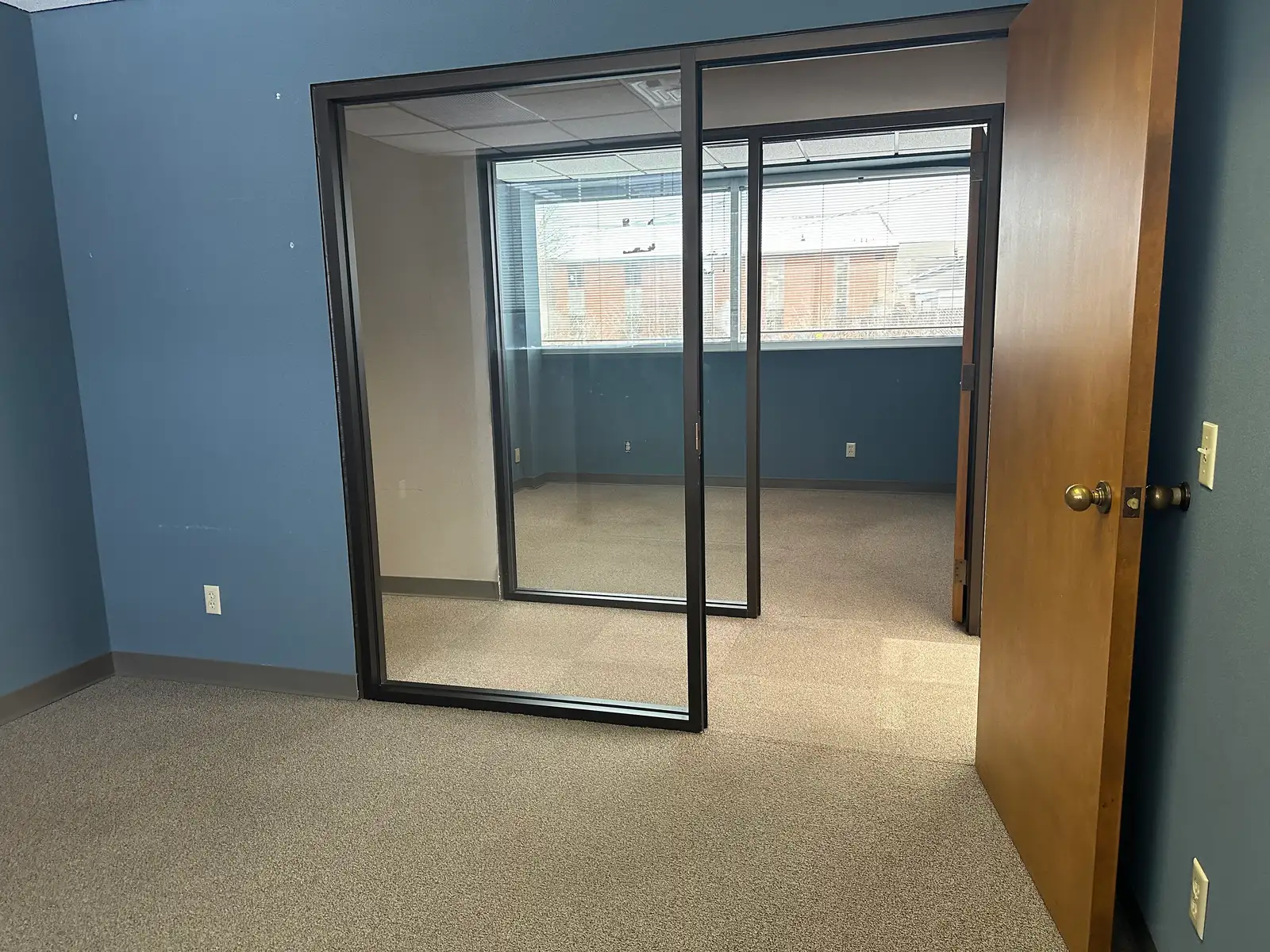 The lobby entry way provides lots of sunlight. The space is fit up for a professional office with open areas and some glassed-walled individual offices. This space would work well for a variety of professional offices including accounting, architecture, financial advising, insurance, and law. Surface parking is ample and included in the monthly lease rate.